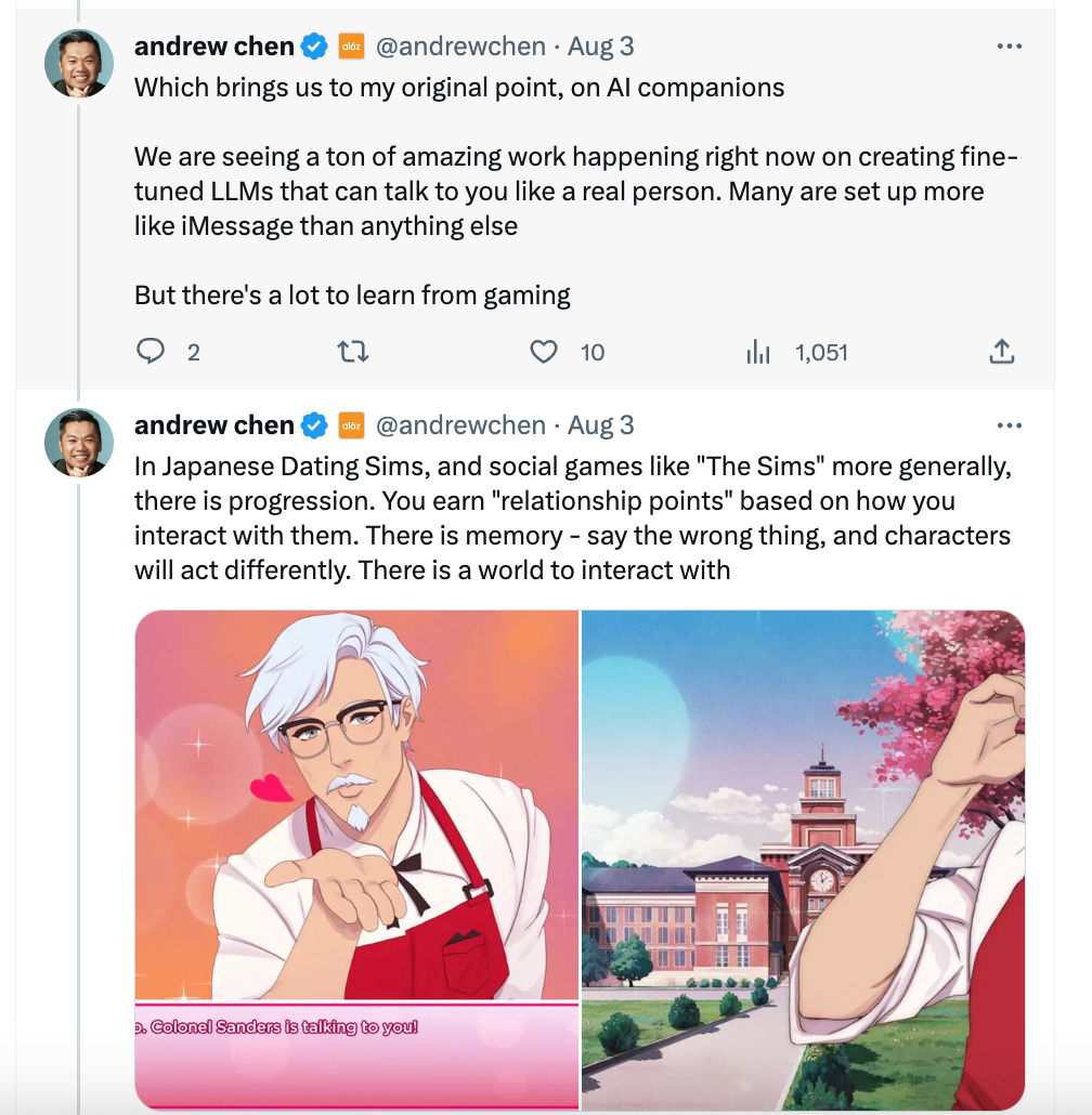 This will lead to a rise in AI companions. Friends, lovers, relationships with AI. Like a real friendship it will be dynamic and the AI will remember how you treated it in the past to form a dynamic relationship that is both challenging and feels “real.”