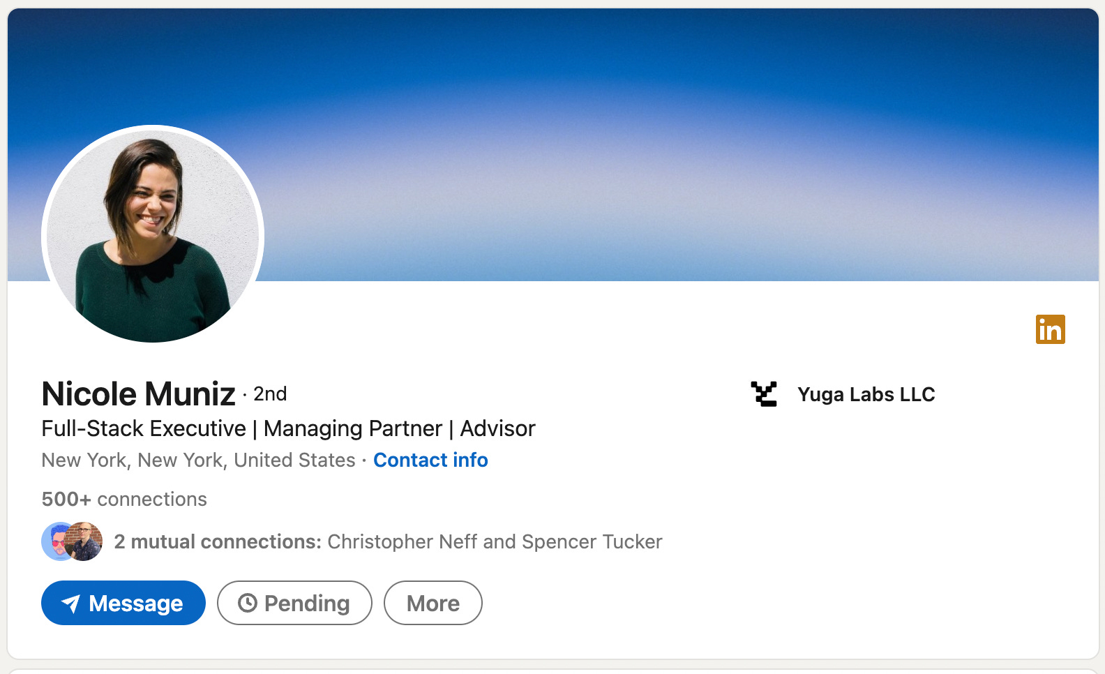 While doing some research I notice that Nicole the CEO of Yuga may not still be the CEO, at least according to her Linkedin Bio. She is not stated as the CEO but rather as a Full Stack Executive. Maybe she is CEO and this is just a unique title or maybe there is a shift to someone new as a new CEO not entirely sure.