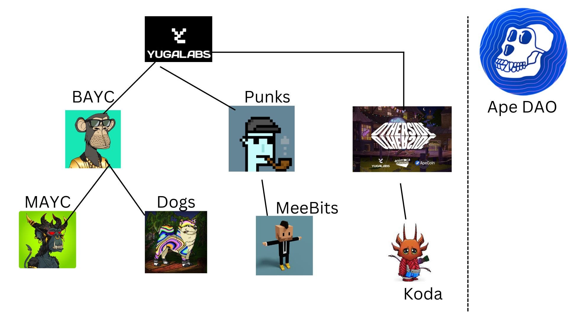 Looking at the above chart, Yuga Labs owns Bored Apes, acquired Punks with funding and Meebits, and has 3 distinct lines of NFTs: