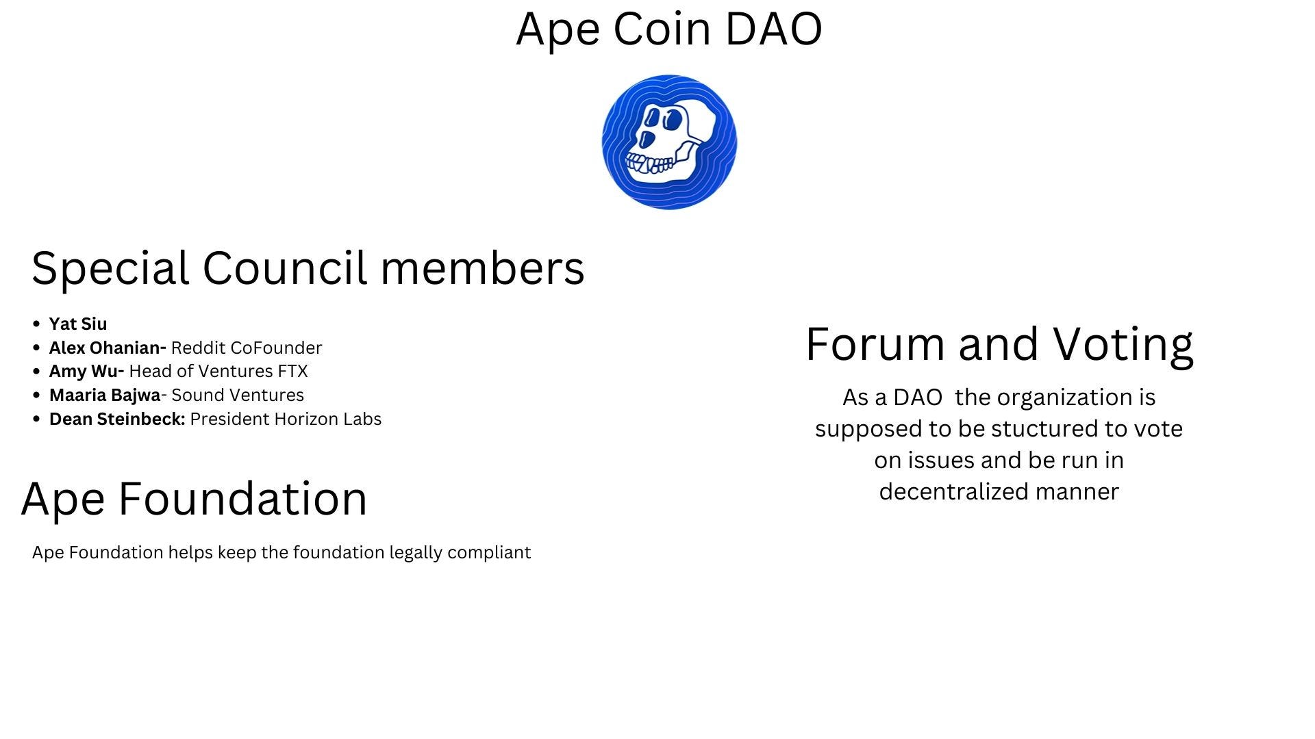 Ape Coin is a coin that was launched by Yuga Labs, and given to holders of Bored Apes and Mutant Apes. This DAO is kept legally separate from Yuga and BAYC as you can see with the dotted line in the image above. Specifically the DAO is set up as a Cayman entity.